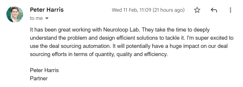 Unlock faster deal sourcing, sharper due diligence, and stronger monitoring. Cut costs, reduce risk, and drive superior fund performance with custom AI agents, tools, and automations built to accelerate your fund’s ROI and elevate your operational edge.