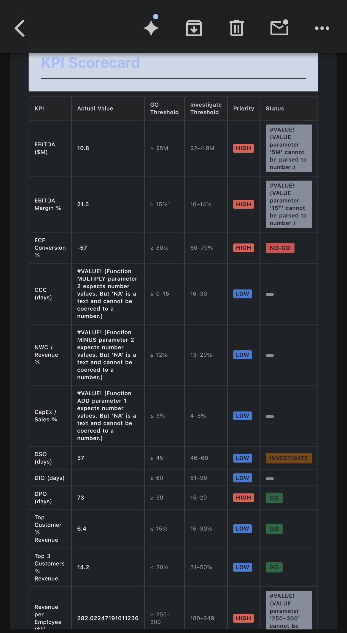 KPI Dashboard tab: This is where they see if this deal is a go/no-go based on different parameters.