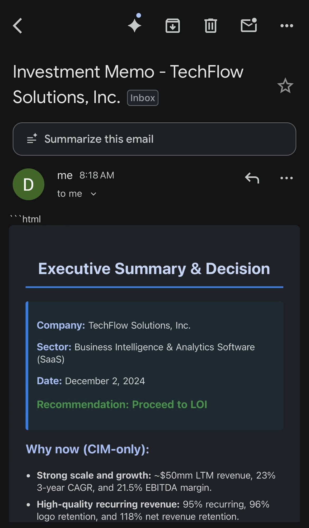 Step 9: Based on all the calculated data, the AI agent creates an investment memo and sends it via email.